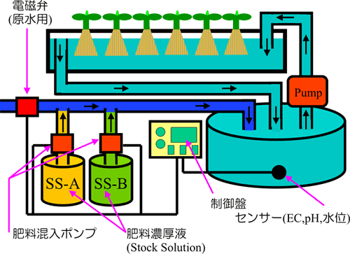 - 培地として土を用いずに、作物の生育に必要な養水分を、水に肥料を溶かした液状肥料(培養液)として与えて栽培する方法.